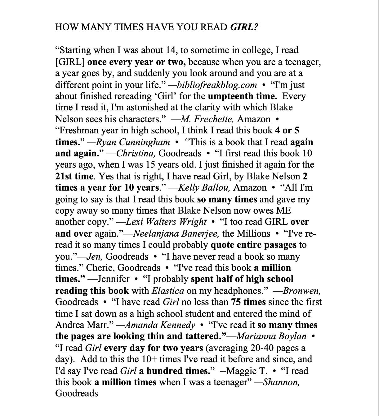 The main thing I was trying to do in the GIRL books was get the reader “out of the pages of a book and into the head of a character.” I wanted these books to “read themselves”. I wanted you to feel like you were talking to an excitable young person outside a club. Someone who was cool and smart and talked fast and didn’t stop to explain who was who, or to give you the backstory, or to explain why something was important. You could either follow along or you couldn’t. I wanted these books to be like a flowing river that never stopped, you couldn’t sit back and try to comprehend the totality of the river, you had to jump into it and let it carry you along.